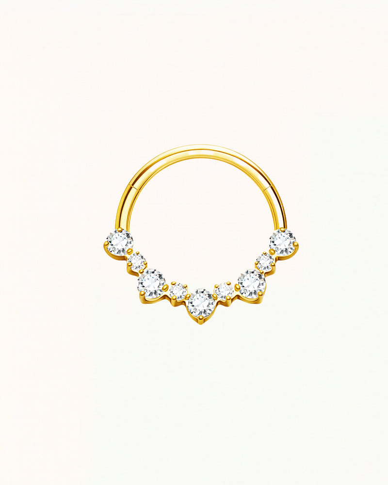 Deze stijlvolle ringpiercing met sierlijk gevormd cluster van fonkelende stenen geeft een luxe en verfijnde uitstraling. Het decoratieve front zorgt voor een uniek silhouet, terwijl de sprankelende stenen een elegant en opvallend accent toevoegen.